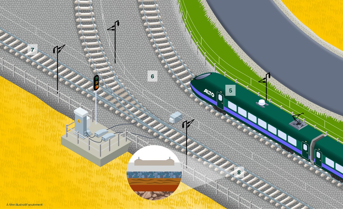9. Alimentation électrique par caténaire et pantographe 10. Cabines spacieuses 11. Wi-Fi performant 12. Rails soudés pour réduire le bruit et les vibrations 13. Réchauffeurs d’aiguille et composantes de voie adaptés aux hivers